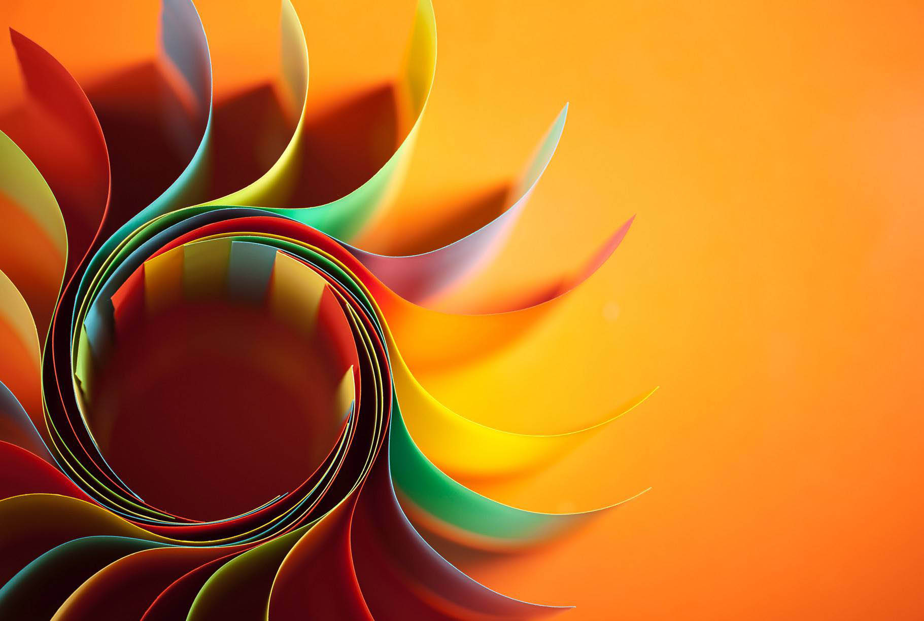 multiple coloured papers fanned out in a sun shape on an orange background